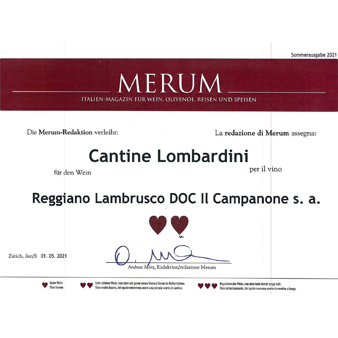 La Rivista Merum ha premiato il nostro Lambrusco “Il Campanone” con due cuoricini: “vino molto buono, del quale vorremmo una scorta in cantina”