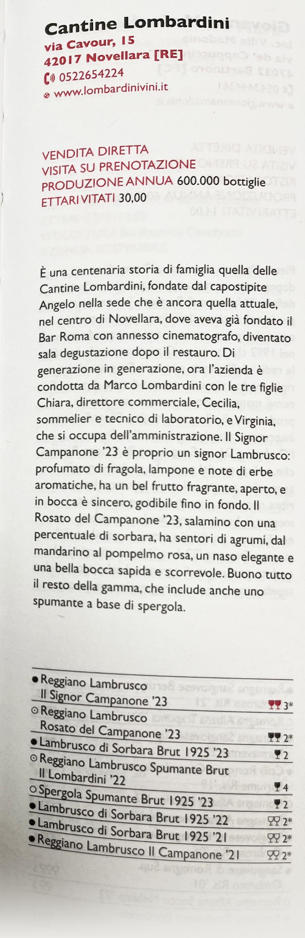 Cantine Lombardini è felice e orgogliosa di annunciare un risultato straordinario che segna una pietra miliare nella nostra storia: per la prima volta, il nostro Signor Campanone ha ricevuto il prestigioso Due Bicchieri Rossi all'interno della guida Vini 2025 di Gambero Rosso. Un riconoscimento che conferma la qualità del nostro Lambrusco e l’impegno costante nel produrre vini che raccontano il territorio e la passione che ci anima.
