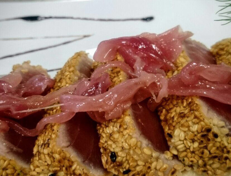 TONNO SCOTTATO SU CREMA DI CANNELLINI E CIPOLLA CARAMELLATA