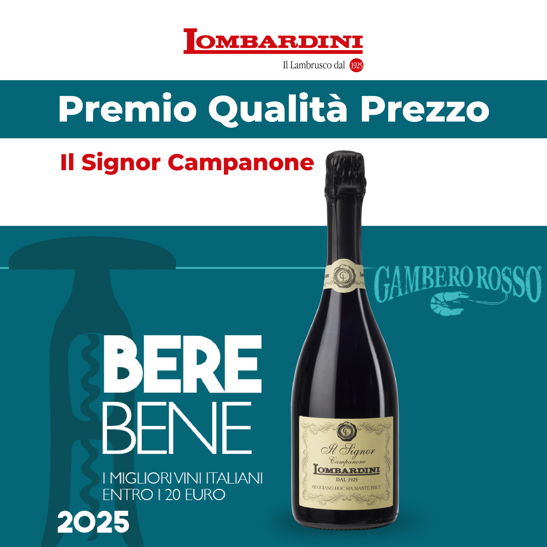 Il Signor Campanone ha ricevuto il Premio Qualità Prezzo all'interno di Berebene 2025, una guida di Gambero Rosso rivolta agli eno-appassionati e agli operatori del settore. Berebene è la guida del Gambero Rosso che premia i vini italiani dal miglior rapporto qualità prezzo. La pubblicazione suggerisce centinaia e centinaia di etichette che si possono acquistare in enoteca o sugli scaffali della GDO entro i 20 euro: ogni vino viene raccontato, descritto e contestualizzato per aiutare il consumatore nella scelta.