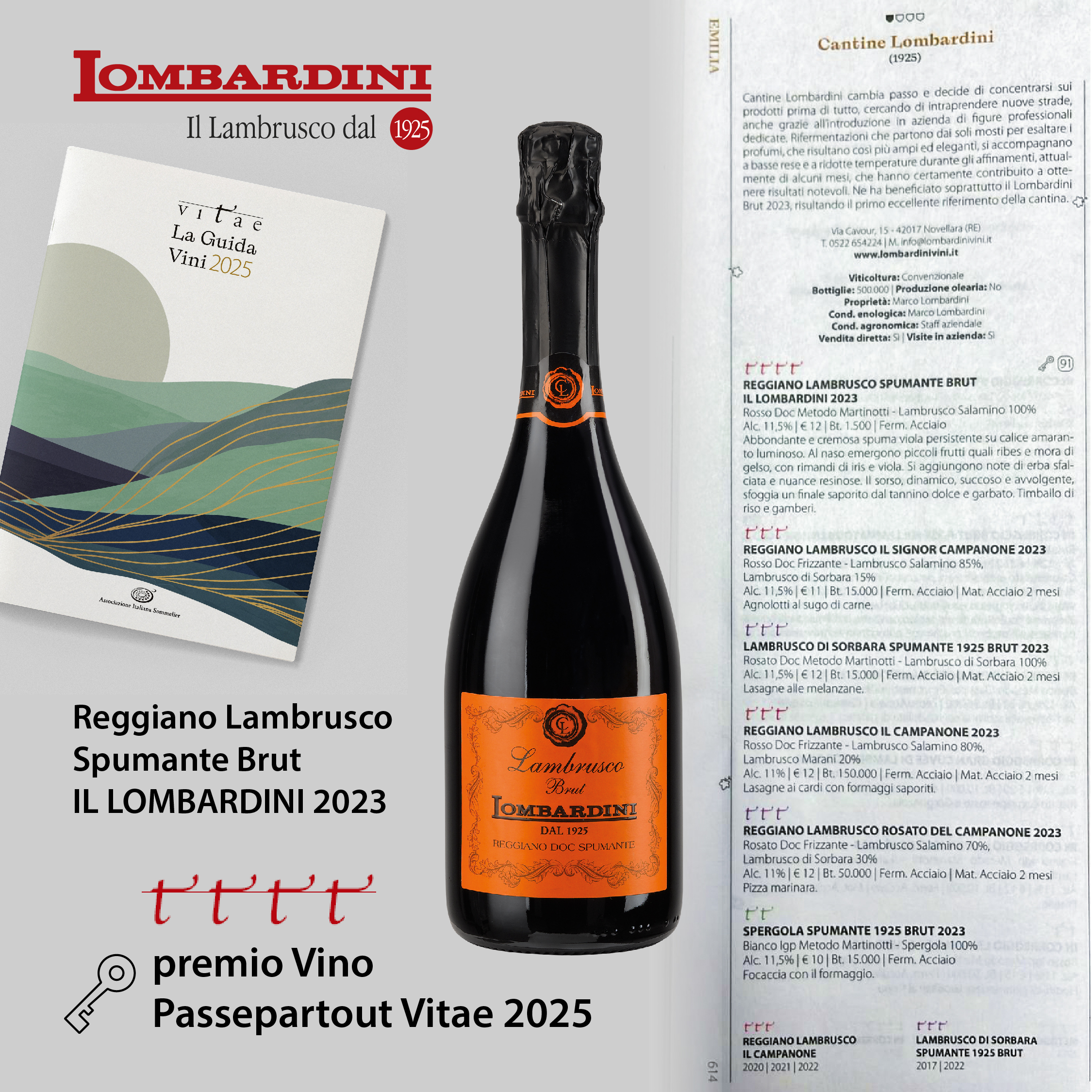 Una menzione d'onore, però, va al nostro REGGIANO LAMBRUSCO SPUMANTE BRUT IL LOMBARDINI 2023, che ha vinto il premio Vino Passepartout Vitae 2025, una referenza preziosa per le carte dei vini dei professionisti della ristorazione grazie alla sua versatilità negli abbinamenti.
