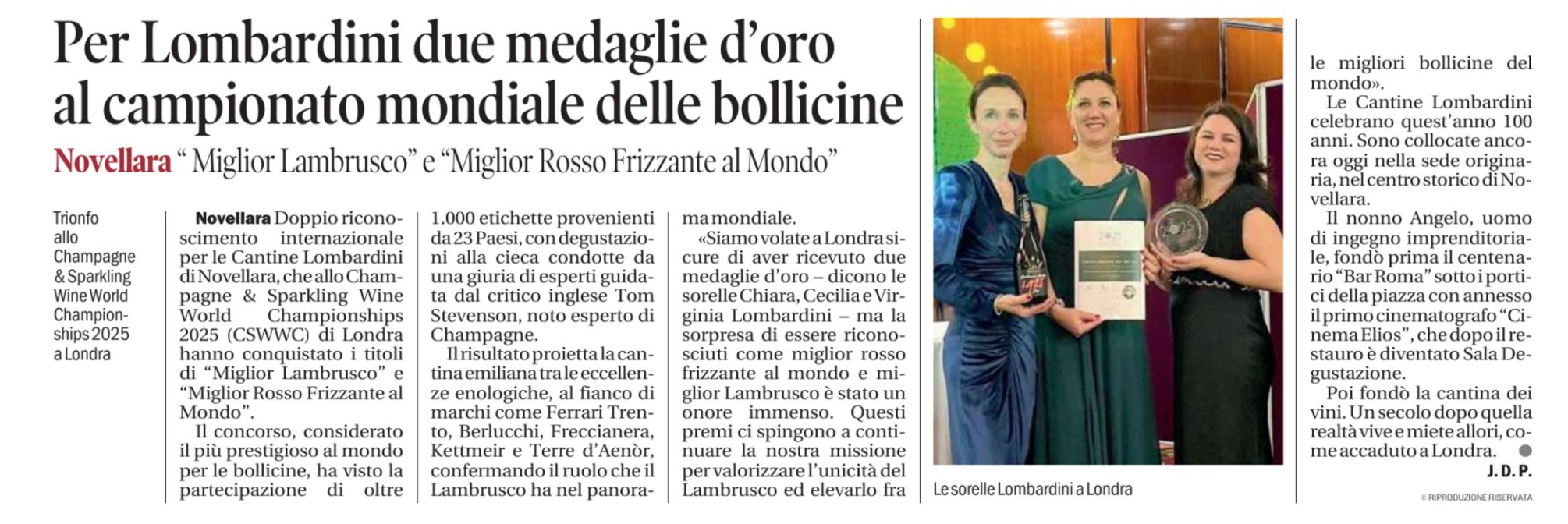 Un sentito ringraziamento alla Gazzetta di Reggio, per aver raccontato il successo di Cantine Lombardini di Novellara al The Champagne & Sparkling Wine World Championships 2025 di Londra.