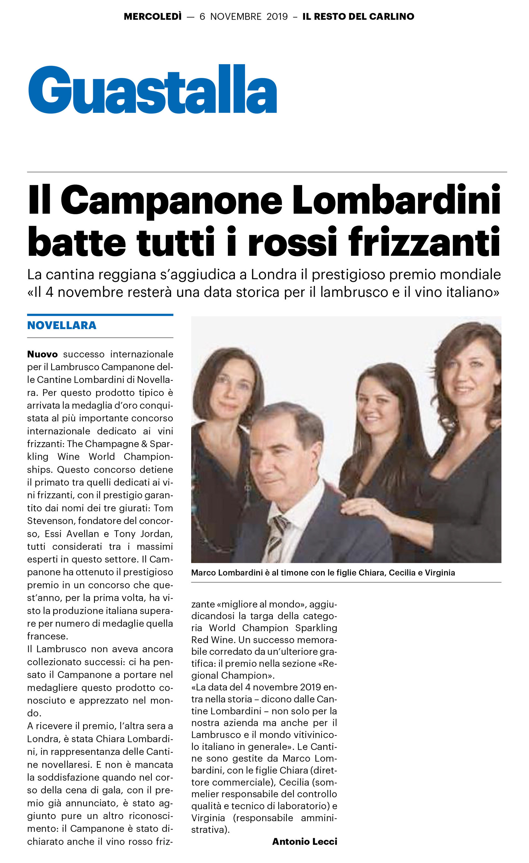 - Reggio Report.it: Cantine Lombardini Medaglia d’oro per il Lambrusco Sorbara al concorso mondiale delle bollicine
